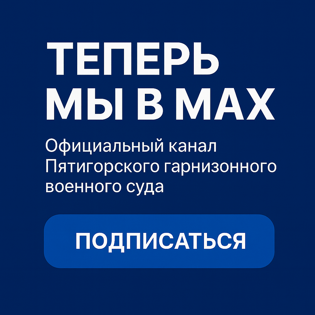 Рады сообщить вам о запуске нашего нового официального канала в мессенджере MAX. Этот шаг направлен на повышение открытости, гласности и удобства получения актуальной правовой информации. На официальном канале размещаются: - актуальные новости и официальные разъяснения в сфере военного законодательства; - вносимые изменения и новые редакции нормативных правовых актов, представляющие практический интерес для военнослужащих и членов их семей; - официальные пресс-релизы и информационные материалы Пятигорского гарнизонного военного суда по различным категориям дел; - аналитические материалы, освещающие вопросы правового регулирования и актуальную правоприменительную практику. Присоединяйтесь, чтобы быть в курсе самых важных правовых новостей! |